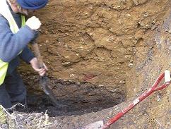 The photograph to the left clearly illustrates the geological makeup of the Ditch. The dark strip of topsoil overlays a deep seam of clay, 'backfill' from the days when brick making was in operation here. A thin, but ever deepening, layer of 'flint rubble', running north-west to south-east, indicates the former lie of the Ditch. Below this level, in the foreground of the photograph, the black humus soil is a build up of sediment in the upper levels of the Ditch. Brick rubble in the foreground, beside the shovel, is further evidence of brick making activities.